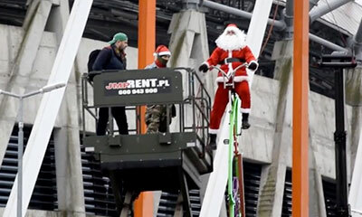 Ce lundi 21 décembre 2020 à Bialystok, en Pologne, le Père Noël devait battre un record du monde : Parcourir 100 mètres sur un vélo géant de 7 mètres de hauteur en forme de sapin de Noël. Manque de chance, notre père noë...