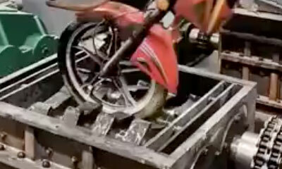 Des images assez impressionnantes d'une moto qui se fait avaler par une broyeuse. On peut voir qu'aucune pièce ne peut résister face aux dents de cette machine qui ne fera qu'une bouchée de cette bécane. Des images très ...
