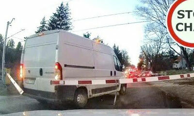 Ce vendredi 4 décembre 2020 à Cracovie, en Pologne, une fourgonnette de livraison s'est retrouvée bloquée entre les barrières baissées d'un passage à niveau. Bloqué à cause d'un embouteillage, le chauffeur de la camionne...