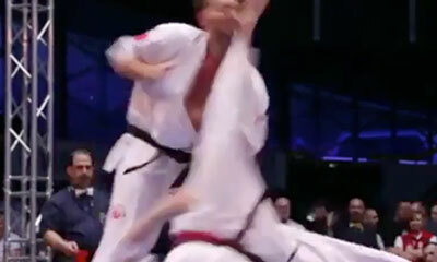 Lors du championnat Européen de ShinKyokushin Karaté, une variante et discipline du karaté, un combattant place un superbe coup de pied. Si le combat semble assez mou et brouillon, l’adversaire placé à droite de l’écran ...