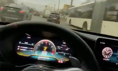 En Russie, un homme au volant de C63 AMG Mercedes roule à plus de 140 km/h sur une route limitée à 70. On peut le voir zigzaguer de gauche à droite entre les véhicules faisant courir des risques fous pour les autres usag...