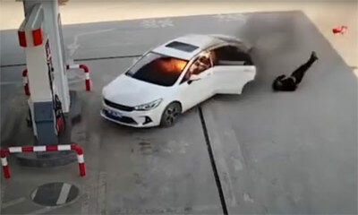 En Chine, deux hommes qui sont dans une voiture en feu déboulent sur le parking d’une station service. Sur cette vidéo filmé par une caméra de sécurité, on peut voir les deux hommes sauter de leur véhicule en flammes alo...