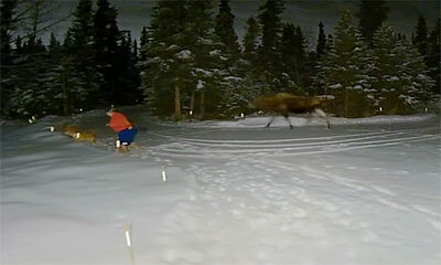 A Anchorage, en Alaska, une femme en short et pied nus sort ses chiens dans la neige dans la nuit. Mais c’est alors qu’elle est surprise par un orignal qui surgit sans un bruit dans son dos pour rejoindre son petit. En v...