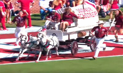 Le Sooner Schooner est la mascotte officielle des équipes sportives de l'Université de l'Oklahoma Sooners. Juste avant l’arrivée de l’équipe de football, le chariot a pénétré le stade a vive allure. Le cocher tente alors...