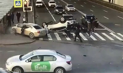 Violent accident sur le pont du canal Obvodniy à Saint-Pétersbourg, en Russie. Le conducteur d'une Volkswagen Polo a grillé le feu rouge à toute vitesse pour venir percuter un Renault Capture. Ce dernier sous le choc de ...