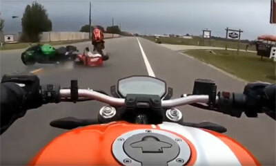Aux États-Unis, un motard filme avec sa caméra embarquée un violent accrochage entre bikers. Alors qu’un deux-roues ralenti pour tourner à gauche, on peut voir surgir une moto qui tente de freiner et venir heurter celui ...