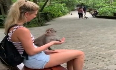 Comme le dit le proverbe ! Ce n’est pas un vieux singe que l’on apprend à faire la grimace. Dans la forêt des singes d'Ubud en Indonésie, une touriste russe est assise sur un banc et veut caresser la queue d’un singe. Po...