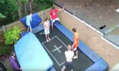 En Angleterre, un jeune homme casse-cou réalise un super saut sur un trampoline avec l'aide de ses amis. Pour cela, ses 4 potes sautent en même temps que lui pour le faire rebondir plus haut tandis qu’un autre est charg...