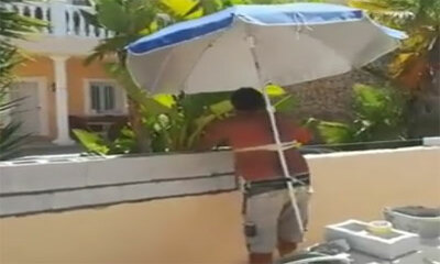 En Amérique du Sud, un ouvrier est fatigué par les grosses chaleurs et trouve que son béret ou casque ne le protège pas assez du soleil. Pas de soucis, il dégaine alors un parasol qui le couvre complément du soleil et pe...