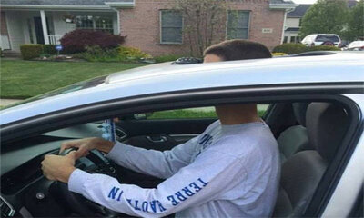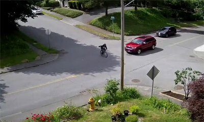 Aux États-Unis, un cycliste complément à la masse déboule comme une descente et grille le Stop à un carrefour. Problème, un automobiliste arrive au même moment et vient frôler le cycliste qui aurait pu provoquer un grâce...
