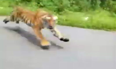 Grosse frayeur pour ces 2 motards ! Un motard et son passager on été pourchassé par un tigre sur une route du parc national de Nagarhole, en Inde. Dans ces moments, tu sers les fesses et tu pousses ta moto à son maximum....