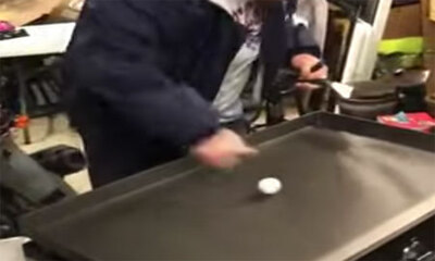 Dans la ville de Lewisburg dans le Tennessee, Régis vient de s’acheter une plaque chauffante Hibachi. Content de lui, il veut alors imiter un chef japonais et fait semblant de faire des figures de style avec ces spatules...