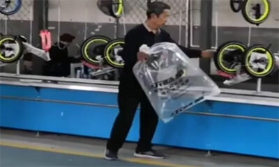 Champion le gars ! Dans une usine ou un entrepôt en Chine, un homme attrape un sac plastique et emballe un vélo en quelques secondes. Digne d’une technique Décathlon genre Queshua, l’homme remplit le sac d'air puis le je...