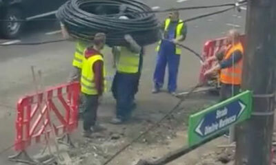 À défaut d'avoir un dérouleur de câble, des ouvriers de chantiers sont obligés de s’organiser pour dérouler un long câble et l'introduire dans une tranchée. Sur cette vidéo, quatre ouvriers soulèvent la bobine et tourne...