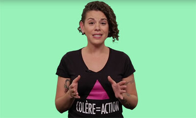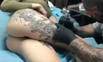 Cette jolie femme brune a été filmée en vidéo par son amie en train de faire des retouches pour son grand impressionnant tatouage. Celle-ci semble fière et heureuse du résultat ou cet énorme tatouage commence du côté dro...