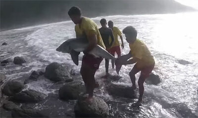 Le samedi 23 mars 2019, des surfeurs ont aperçu un bébé grand requin blanc échoué sur les rochers à Victoria Bay, en Afrique du Sud. De suite, ils ont tenté de le remettre à l’eau puis ont demandé de l’aide à des nageurs...