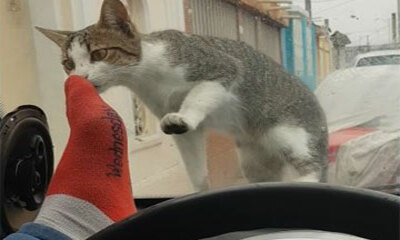 Alors que Régis se reposait à l'intérieur de sa voiture stationnée dans une rue de Guayaquil, en Équateur, un chat est venu le déranger en venant s’assoir sur le capot du véhicule. Notre ami va alors essayer de faire fui...