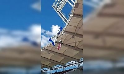 Un parachutiste devait atterrir sur la pelouse du Stade de Toulouse avant un match de rugby entre Toulouse et Sale. Il transportait le ballon du match. Mais au lieu de se poser, il est resté coincé à environ 30 mètres du...