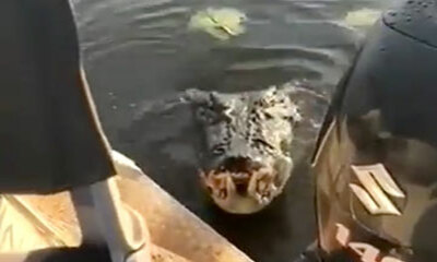 La vidéo montre un crocodile qui essaie en un saut de grimper dans une embarcation de pêcheurs qui voyagent sur le fleuve Murray en Australie. Alors qu’un des pêcheurs filme le reptile qui sort son nez de l'eau, ce derni...