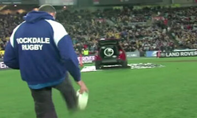 Ce fan australien de rugby n'a pas été trop préoccupé par la défaite des Wallabies à Sydney ce week-end. Durant la mi-temps, trois spectateurs tirés au hasard dans la foule ont eu la chance de pouvoir frapper dans un bal...