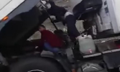 Sur une route au Brésil, un camionneur est un homme pressé et continue de rouler pendant que deux collègues effectuent des réparations sous la cabine. Sur la vidéo, on peut la voir basculée vers l'avant, du camion tandis...