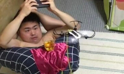 Le Japonais Uekusa réalise un nouveau trick avec un drone. Pour cela, s’allonge sur le dos avec les pieds derrière la tête, puis retire la serviette placé sous un verre plein posé sur ses fesses avec l'aide du petit dron...