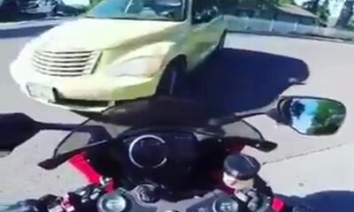 Aux États-Unis, un motard qui se trouve à un STOP se fait rentrer dedans par une voiture. Pas content, il saute de sa moto pour courir vers le conducteur et lui briser sa vitre comme un fou furieux. https://www.youtub...