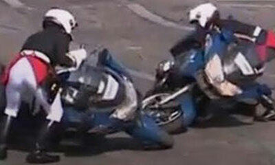 Lors du défilé militaire du 14 juillet à Paris, deux motards de la gendarmerie sont entrés en collision à l'ombre de l'obélisque de la Concorde. Grâce à la faible vitesse des véhicules, la collision s'est révélée sans gr...