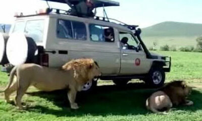 Un touriste imprudent assis dans un Toyota Land Cruiser Troopy pendant un safari en Afrique du Sud a voulu caresser un lion. Mais le roi de la jungle va lui alors montrer ses crocs et vite lui faire perdre son excès de c...