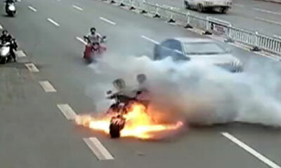 Des images de surveillance montrent un scooter électrique transportant deux hommes qui a soudainement pris feu. L’accident s’est produit le 4 juin 2018 Lanzhou en Chine et montre un scooter électrique prendre feu comme l...