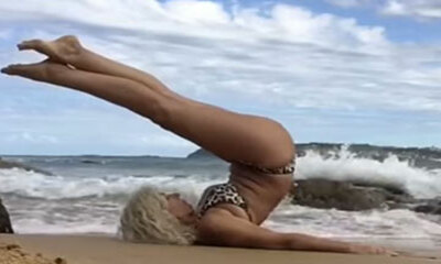 Une jolie blonde tente quelques figures de yoga sur le bord de la mer. Cette femme mature à la chevelure blonde, bikini léopard et peau bronzée doit surement être une usine à fantasmes pour les adorateurs de femmes couga...