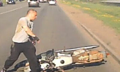 A Izjhevsk en Russie, un motard pris dans un ralentissement veut profiter de sa mobilité pour gagner du temps et doubler les autres usagers de la route. Pour cela, il décide de grimper sur le trottoir puis de rouler sur ...