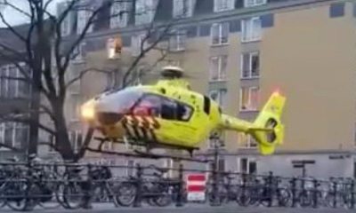 Après qu’une personne soit tombé à la surface gelée d’un canal d’Amsterdam (Pays-Bas), un hélicoptère de secours doit atterrit sur le pont chevauchant le canal Prinsengracht. Par chance, la victime a été secouru ! htt...