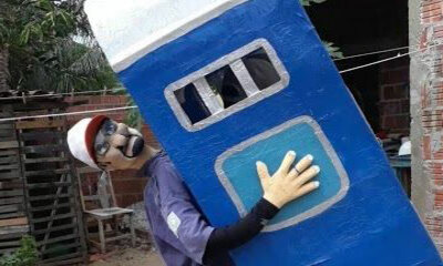 Les images d’un amusant costume qui donne l'illusion qu'un homme soulève des toilettes de chantier. Et comme finition, nous avons un homme assis à l'intérieur qui semble faire ses besoins. Ce costume a été crée par un ha...
