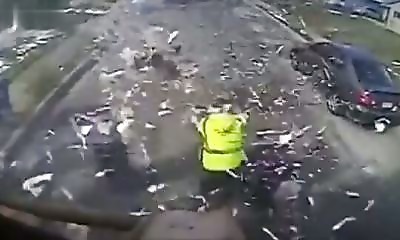 Des employés d'un service de collecte des déchets dans l'Ohio chargeaient des ordures dans leur camion quand une explosion s'est produite à l’arrière. Une caméra a capté le moment où les déchets étaient broyés juste avan...