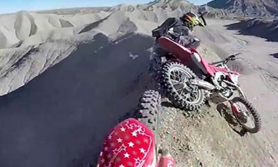 Gavin Godfrey avec son ami Preston se sont rendu à Caineville dans l’Utah pour ses paysages arides pratiquement lunaires. Au guidon de sa moto, Gavin qui roule sur une crête va avoir une petite frayeur en perdant le cont...