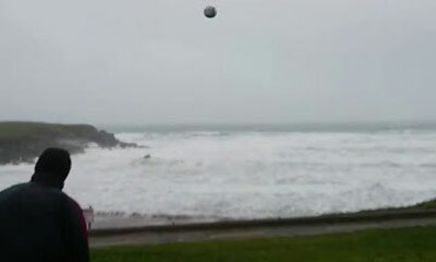 La semaine dernière à St Finian's Bay en Irlande, un homme s'amuse seul au football et a trouvé un compagnon de jeu. Pour cela, il tire face au vent dans un ballon de football qui poussé par le vent revient tel un boomer...