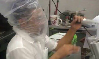 La technique d'un homme pour couper des oignons sans avoir les yeux qui piquent. Simple, il met sa tête dans un sac en plastique pendant qu'il coupe les oignons dans la machine. Ainsi, ses yeux sont protégés ! Par contre...