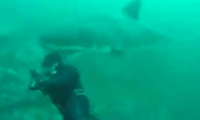 Une expérience assez effrayante pour ce plongeur. Alors qu’il fait de la plongée sous-marine au large des côtes d'Afrique du Sud, un grand requin blanc apparait subitement derrière lui et vient lui heurter sa tête avec s...