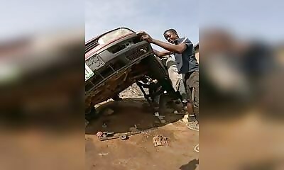 Cinq hommes soulèvent une Volkswagen Golf pour permettre à un mécanicien de la réparer en toute sécurité. L'endroit ne ressemble pas à un garage classique, mais le travail s'effectue malgré tout. Dans certaines régions d...
