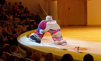 Deux personnes se battent sur une scène. Los d’un spectacle de cirque en Russie, un artiste s’amuse à faire croire qu’il se bat avec une autre personne avec l’aide d’un déguisement. Simple et efficace ! https://www.yo...