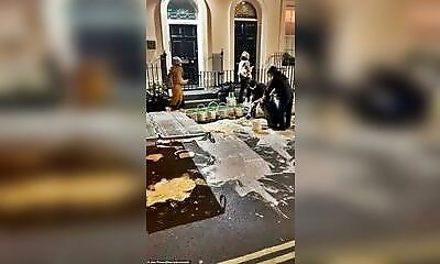 Devant une galerie d’art à Londres, un employé de livraison a accidentellement renversé des seaux géants de mayonnaise, formant une flaque glissante sur le trottoir, et suscitant l'étonnement des passants.