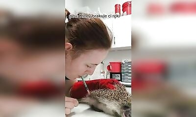 Une vétérinaire polonaise montre comment faire une injection intramusculaire à un hérisson sans aide. Elle tient le hérisson avec sa main gauche et attrape une patte avec sa main droite. La seringue est maintenue dans sa...