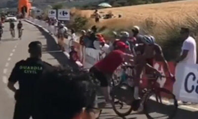 Lors de la 12e étape de la Vuelta en Espagne, un policier de Guardia Civil s’est énervé sur un spectateur qui courrait trop près des cyclistes. Pour cela, il l’a poussé fermement mais en direction d’une moto de dépannage...