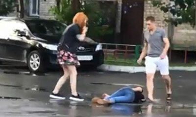 En Ukraine, un homme n’apprécie pas de voir sa copine rentrer de soirée complètement ivre. Sur ces images, on peut voir une fille ramener sa copine totalement ivre devant chez elle. Cette dernière est écroulée dans une f...