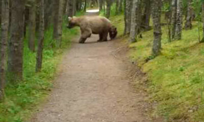 Durant une randonnée dans le parc national de Katmai en Alaska, un homme s’est retrouvé sur un sentier face à une maman Grizzly et ses deux petits des "Grizzlyons". Celui-ci a préféré reculer en filmant cette scène peu ...