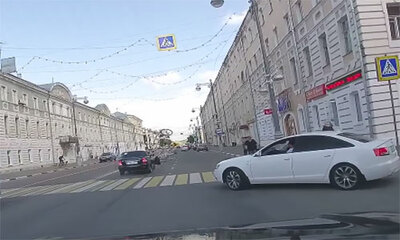 Alors qu’un cycliste travers à pied sur un passage piéton en tenant son vélo à la main, une femme au volant vient le percuter. Sur ces images filmées à partir d’une caméra embarquée, on peut voir la voiture ne pas freine...