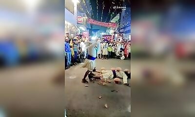Les yeux bandés, un homme s'amuse à mettre des coups de masse à quelques centimètres de son partenaire, allongé au sol.