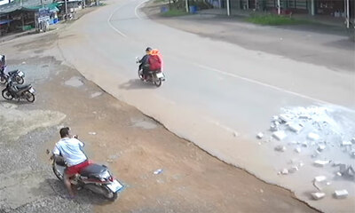 Enfin, c'est plutôt le bloc qui évite de justesse le couple à moto. En Asie, alors que Roméo et Juliette circulent à moto, ils passent à côté d'un camion qui transporte des blocs de béton. Mais dans un virage, l'un d'eux...