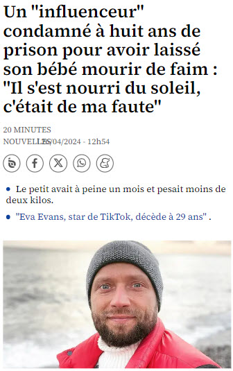 Maxim Lyutyi, un influenceur russe de 44 ans, a été récemment condamné à huit années d'emprisonnement pour avoir négligé son nourrisson, Kosmos, qui n'avait qu'un mois. Lyutyi pratiquait un régime pranique, croyant que l'on pouvait se nourrir uniquement de lumière solaire et d'air, ce qui a tragiquement conduit à la mort de son fils par pneumonie et malnutrition. Le bébé, en état de grave sous-nutrition, pesait moins de deux kilos lorsqu'il a été emmené à l'hôpital, où il est décédé malgré les interventions médicales.